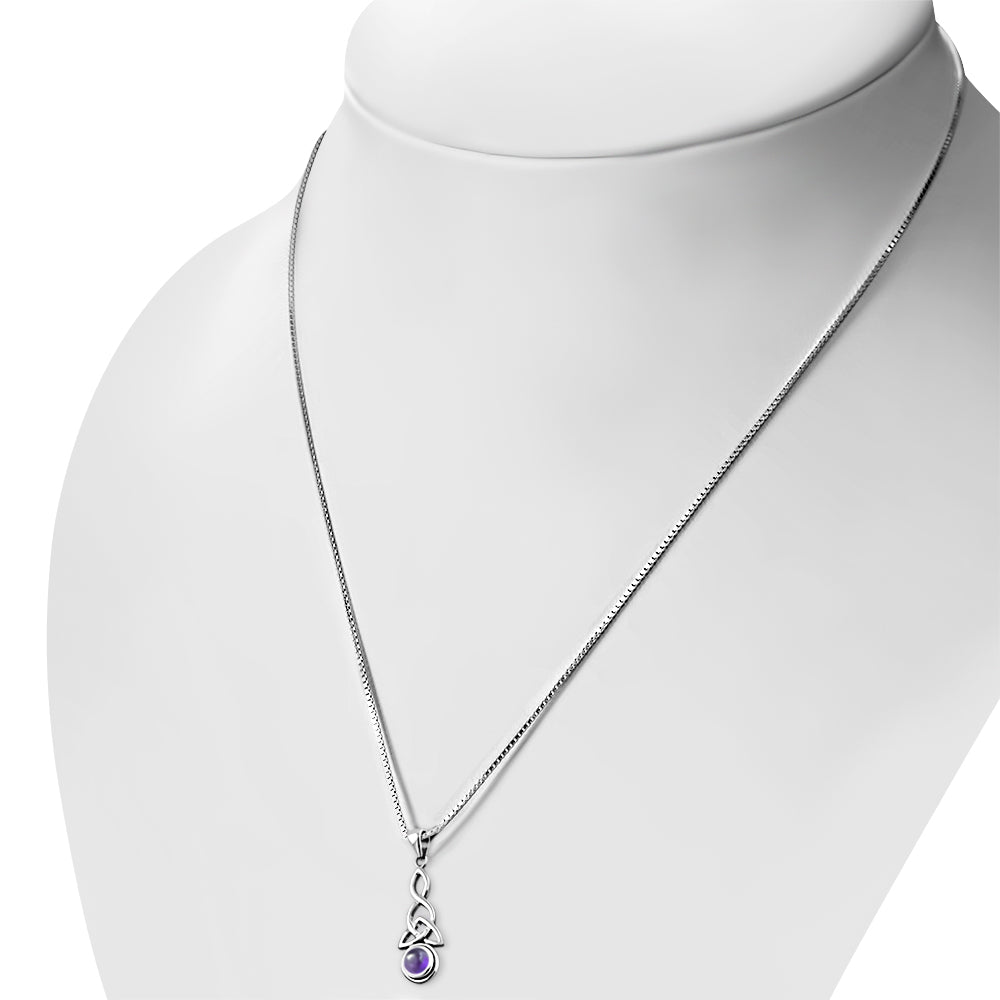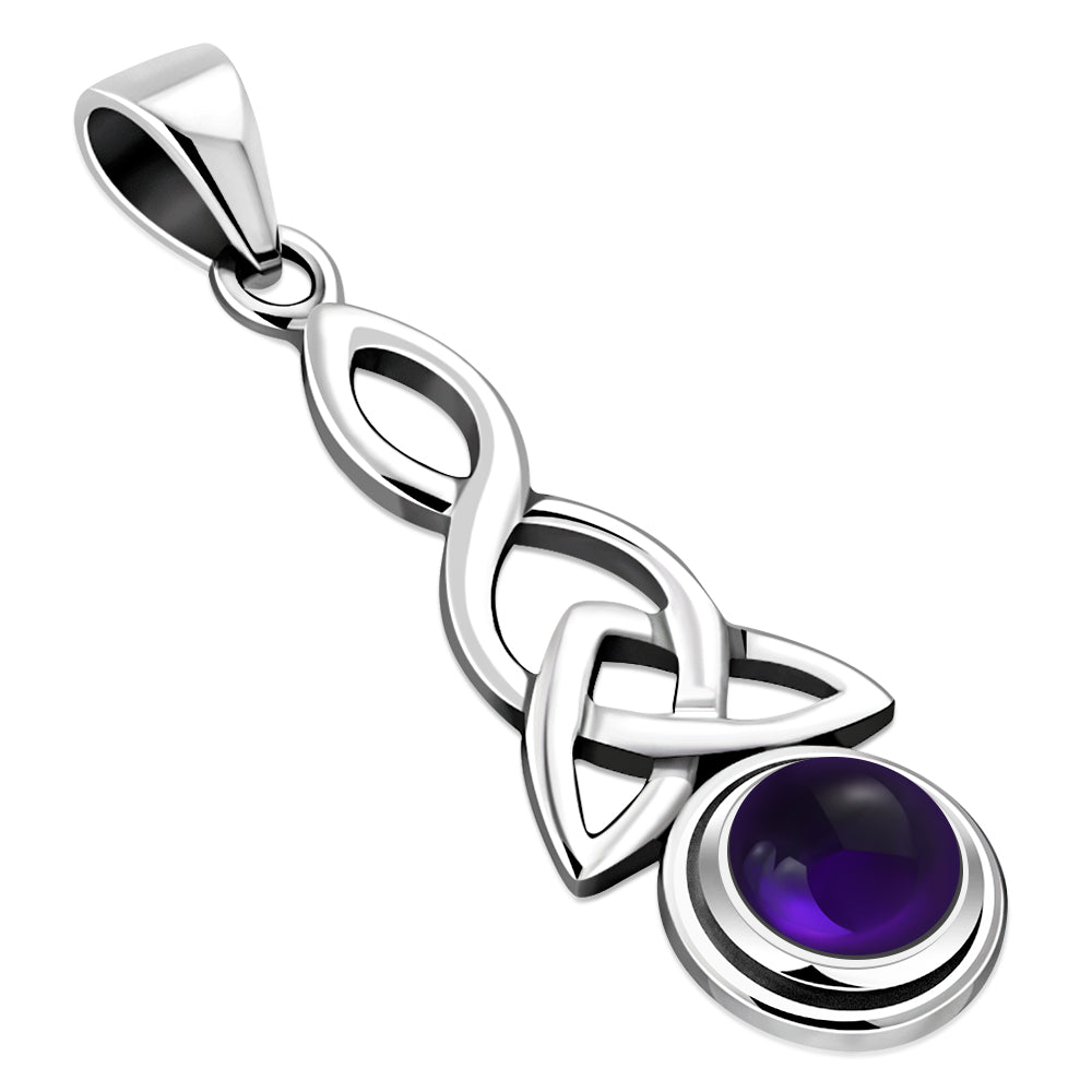 Long Amethyst Stone Celtic Trinity Knot Silver Pendant