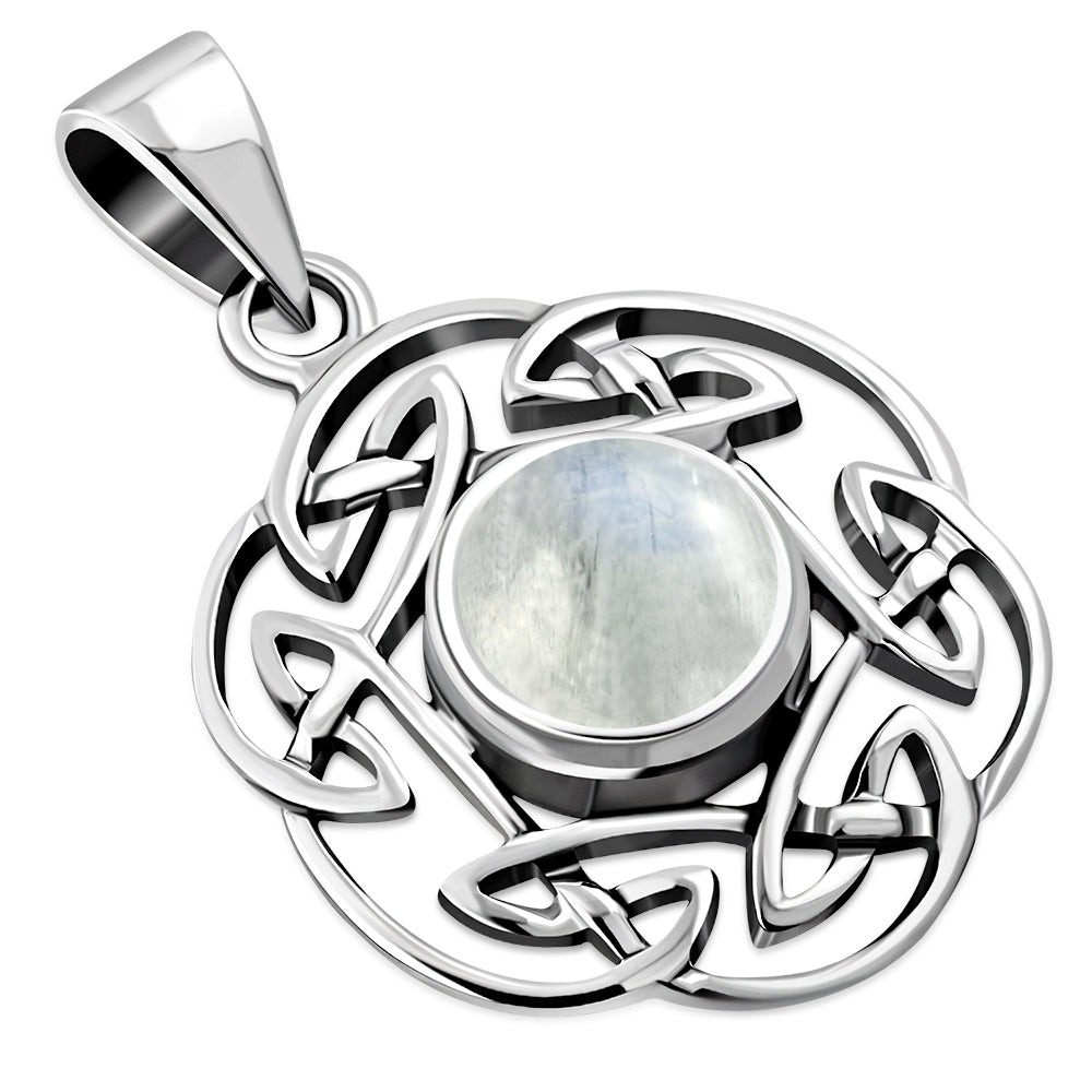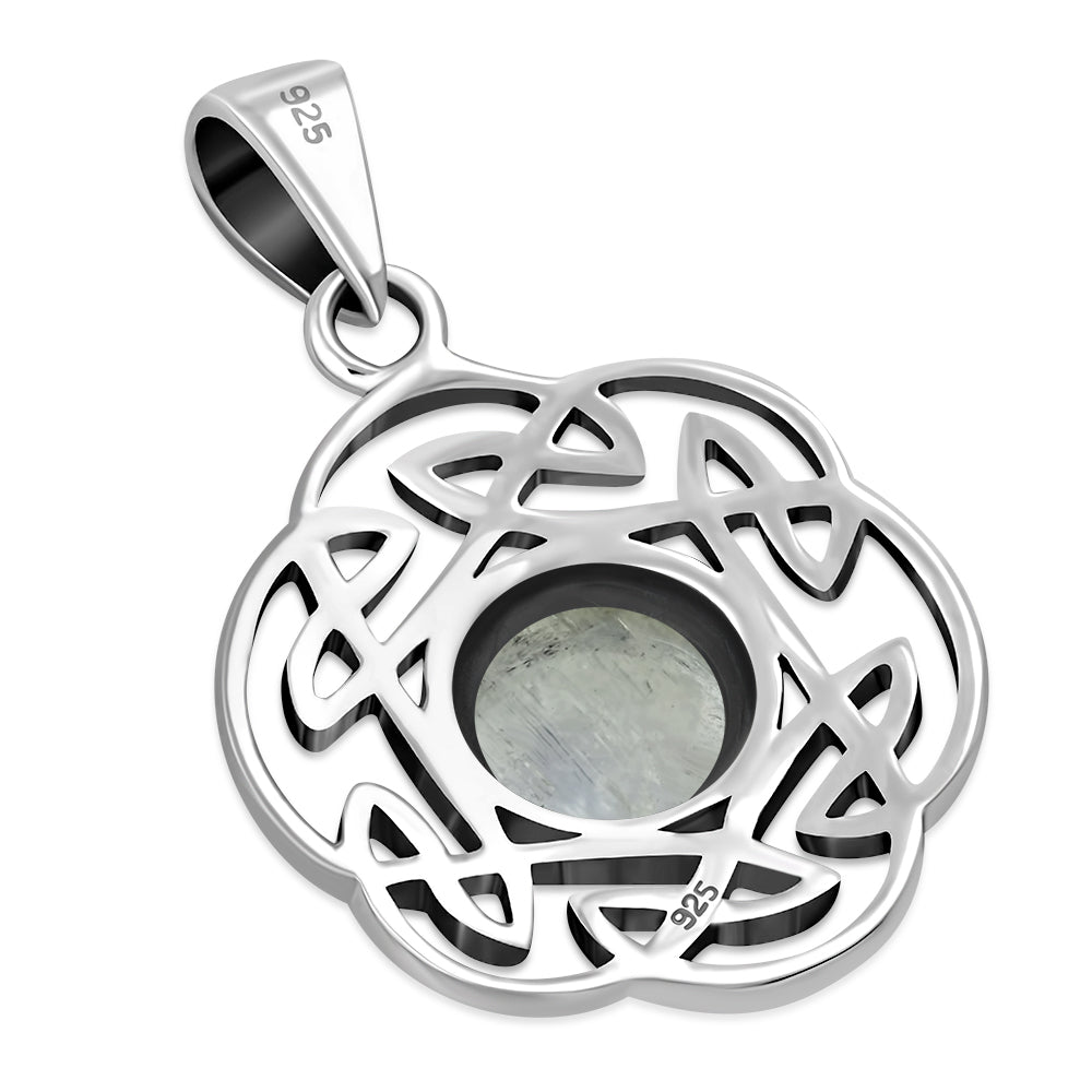 Rainbow Moonstone Round Celtic Knot Silver Pendant
