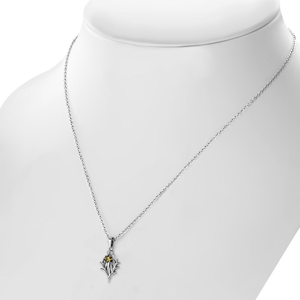 Citrine, November's birthstone, often associated with abundance and joy, complements the thistle's symbolism perfectly. This contemporary pendant blends traditional Scottish design with modern elegance.