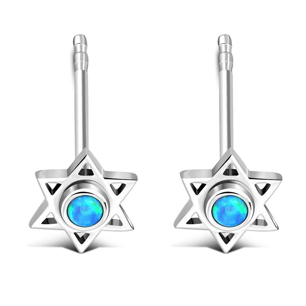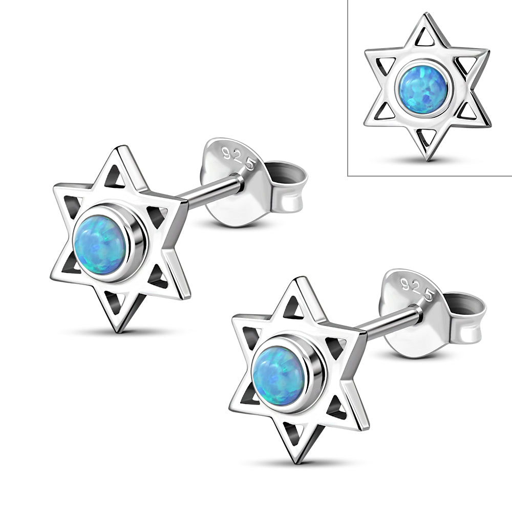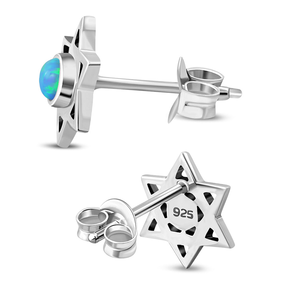 Star Of David Jewish Judaica 925 Sterling Silver Stud Earrings With Synthetic Blue Opal