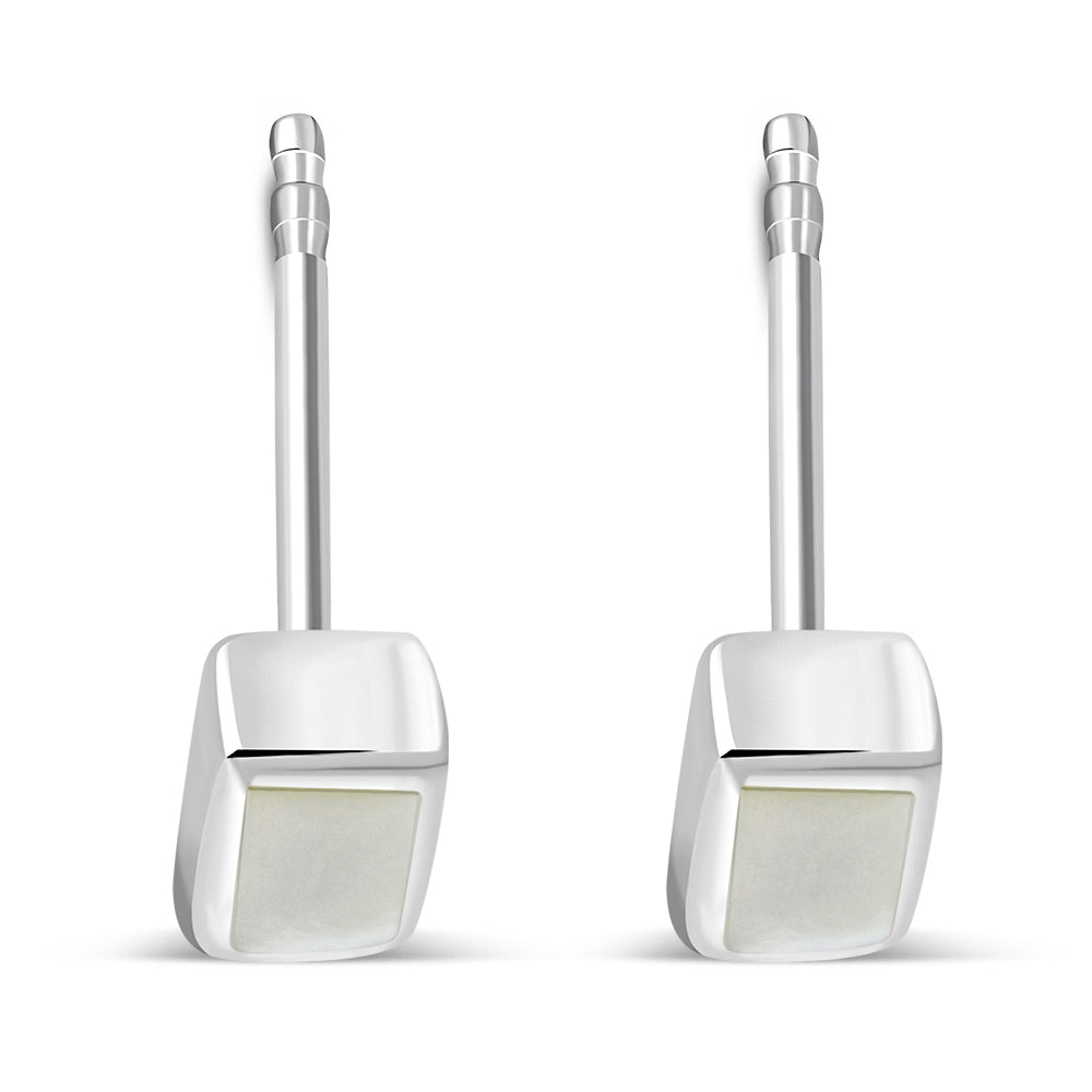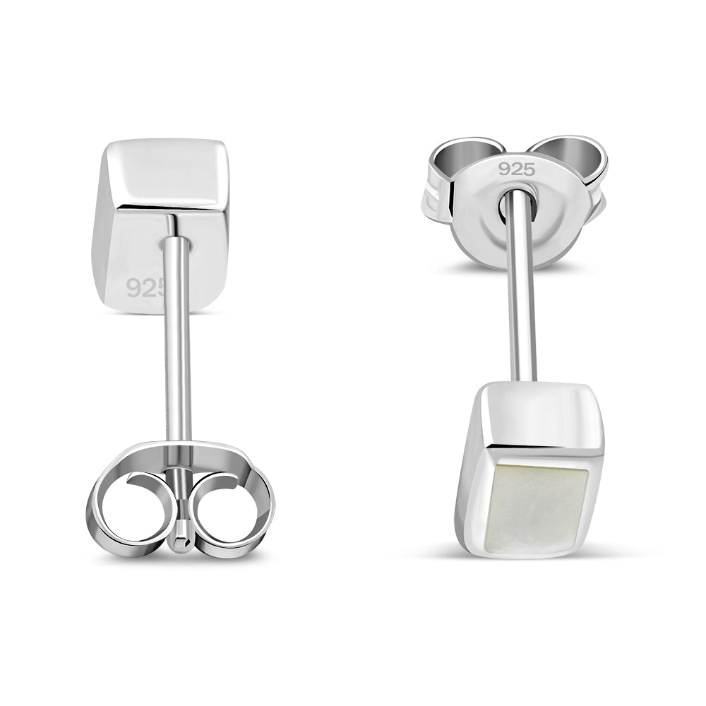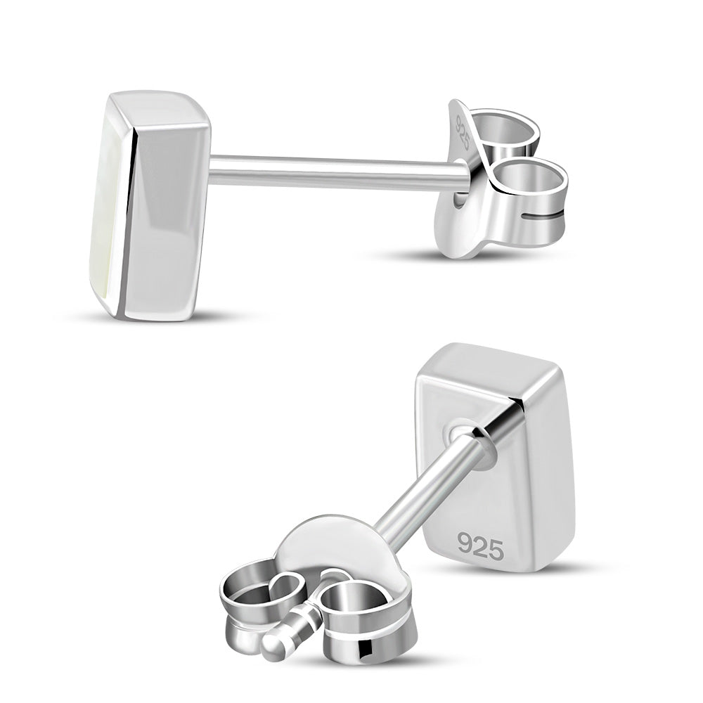 These minimalist rectangle silver stud earrings, adorned with shimmering mother of pearl shell, exude timeless elegance.