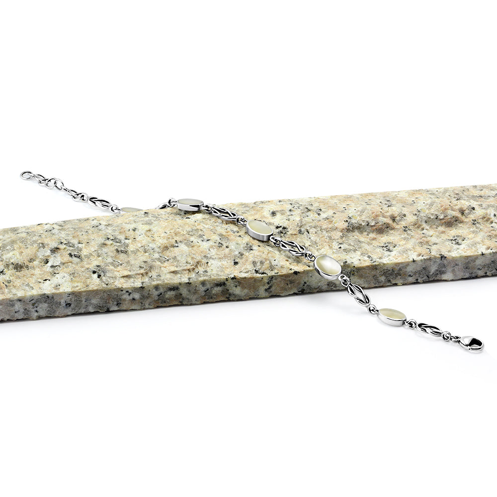 This Celtic bracelet blends tradition with elegance. Intertwined silver knots, symbolizing eternal bonds, frame shimmering mother-of-pearl ovals.