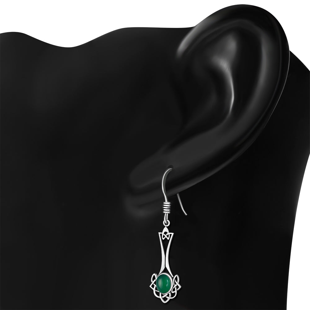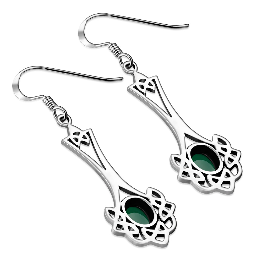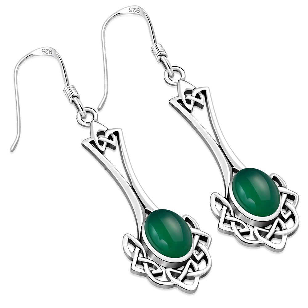 A long, flower-like charm, adorned with a captivating green agate stone, is encircled by intricate Celtic knots, ancient symbols of eternal life and connection. The earrings offer a contemporary twist on timeless heritage.