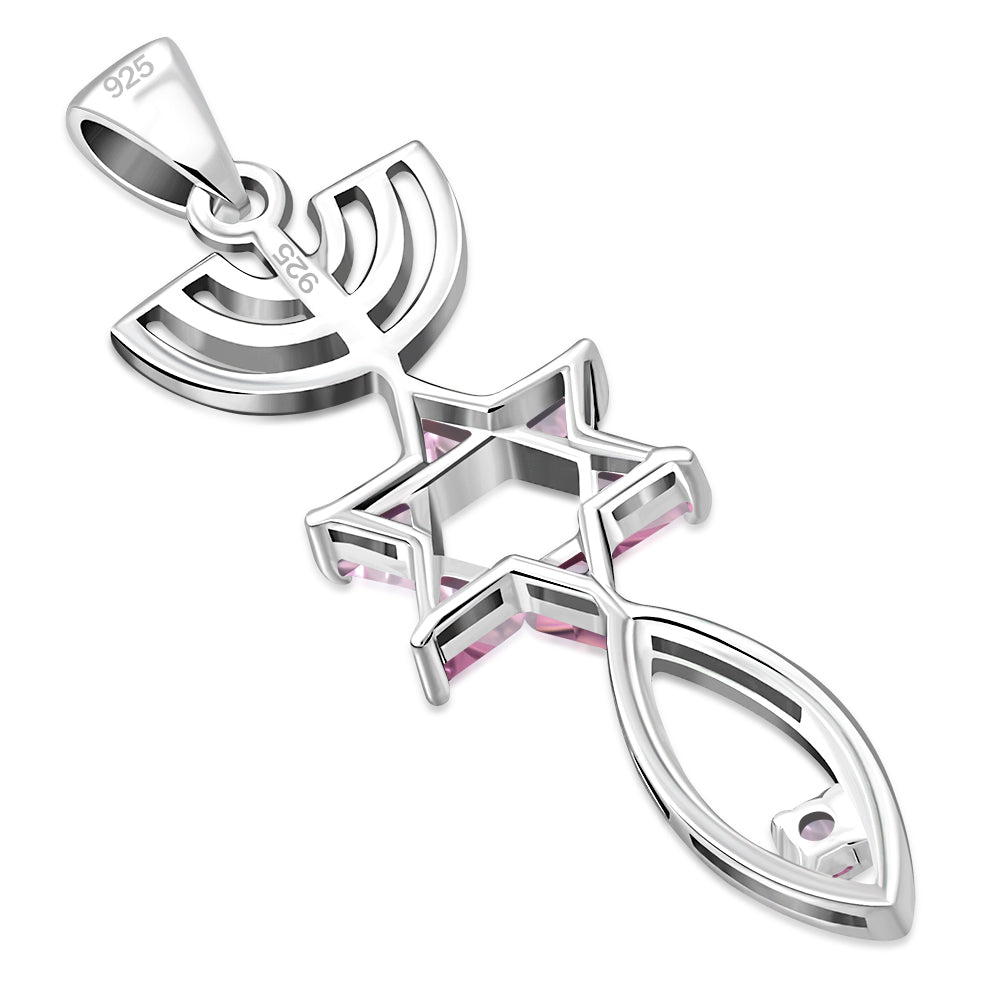 The Star of David is a symbol of Judaism, while the Ichthys fish is an early Christian symbol. A sparkling rose pink cubic zirconia adds a touch of delicate beauty.