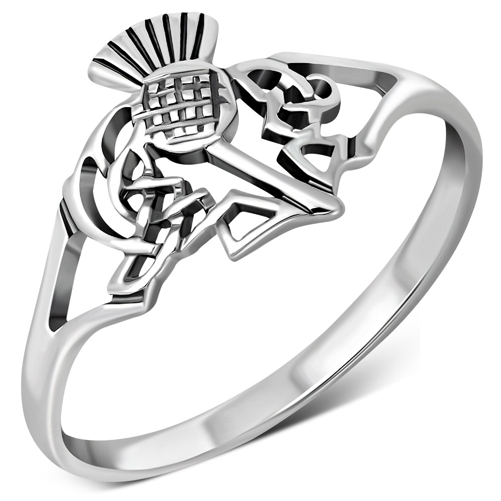 The thistle, a symbol of resilience and fortitude, is intricately woven with Celtic knotwork, representing eternity and unity. This ring is a testament to Scottish heritage and craftsmanship.
