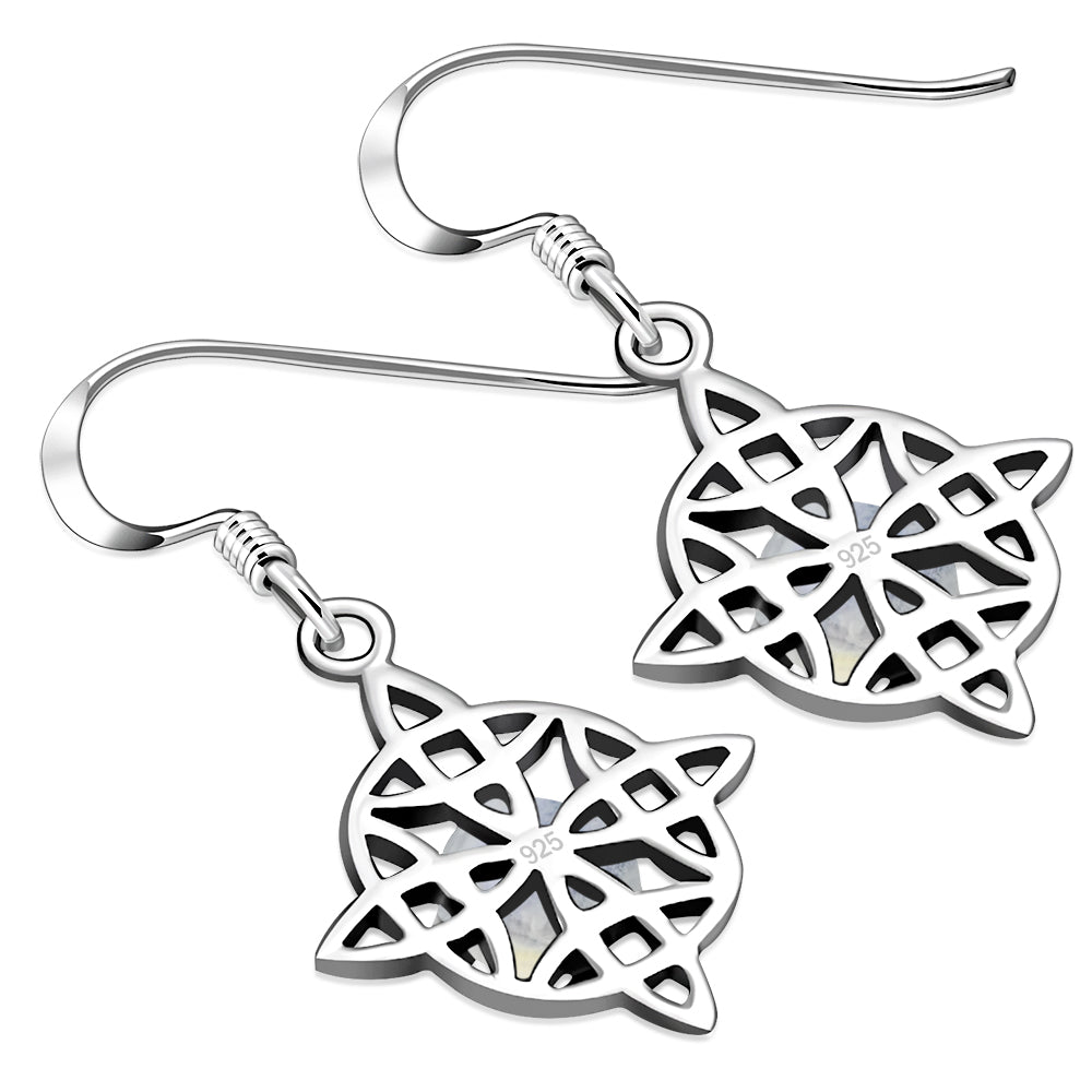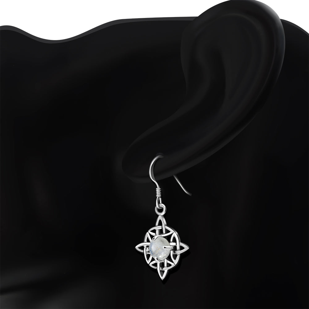 These Sterling Silver Dangling Hook Earrings showcase a captivating Celtic knot charm with a mesmerizing Rainbow Moonstone at its heart.