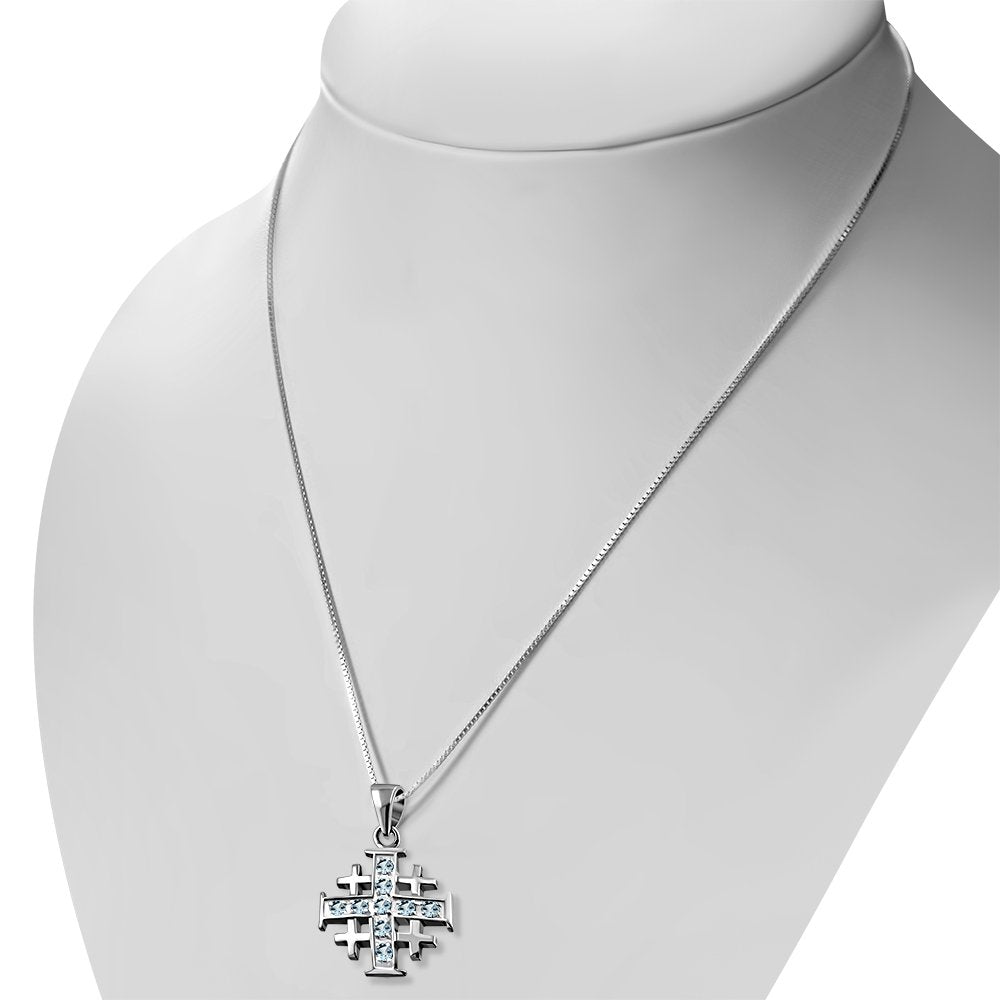 Blue Topaz CZ Jerusalem Cross Silver Pendant